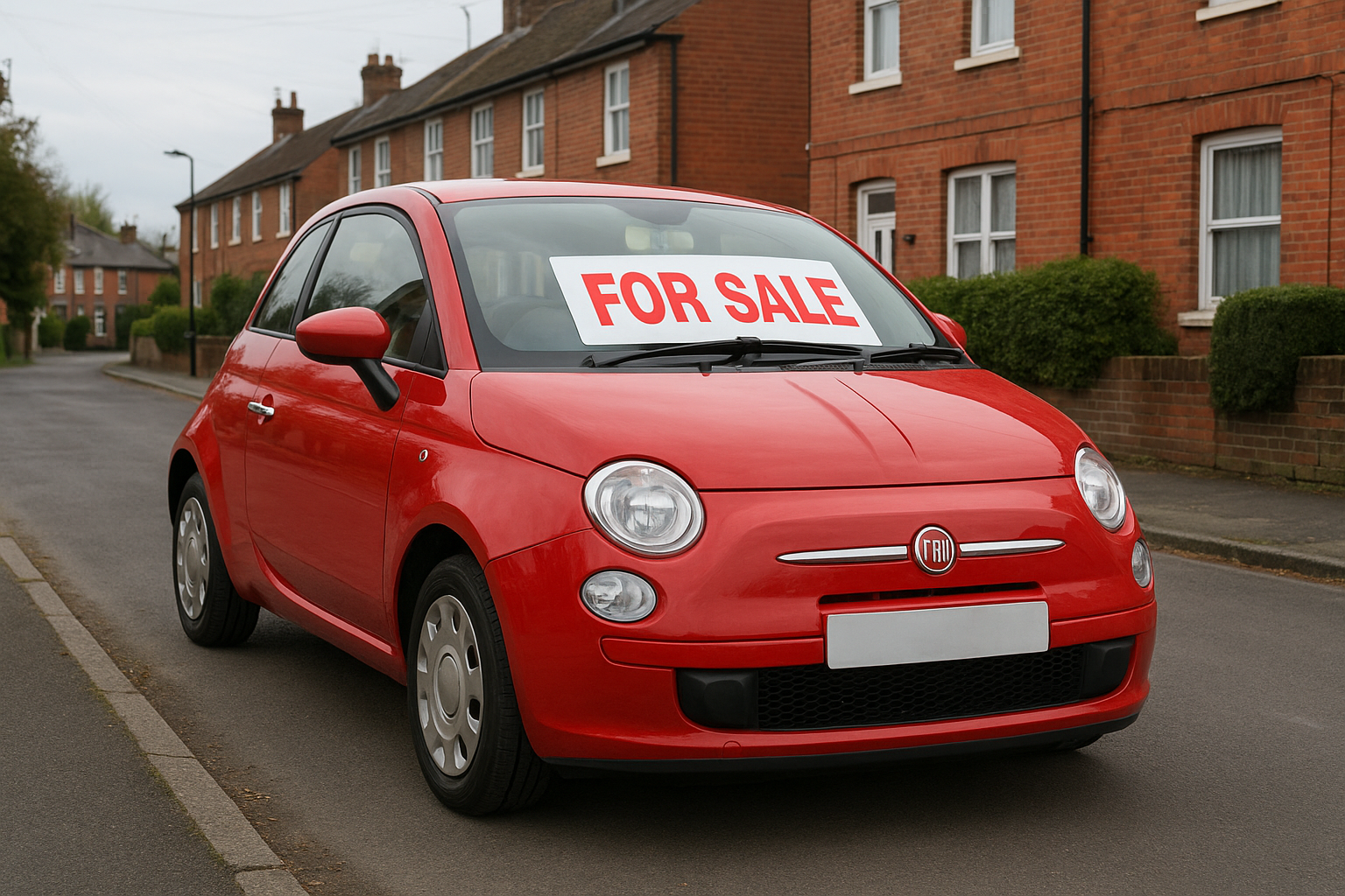 Red compact Fiat car parked on the street with a 'For Sale' sign in the windshield.