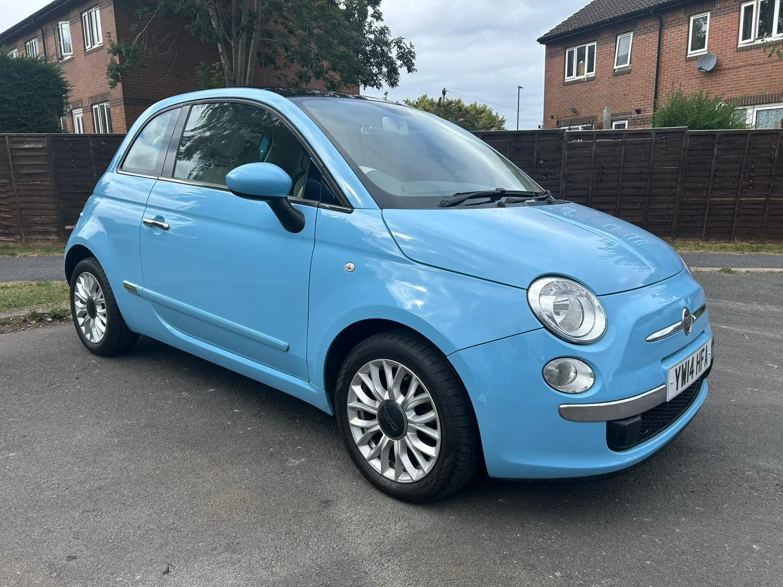 A light blue Fiat 500 parked on the street in a residential area with brick buildings and a wooden fence in the background.
