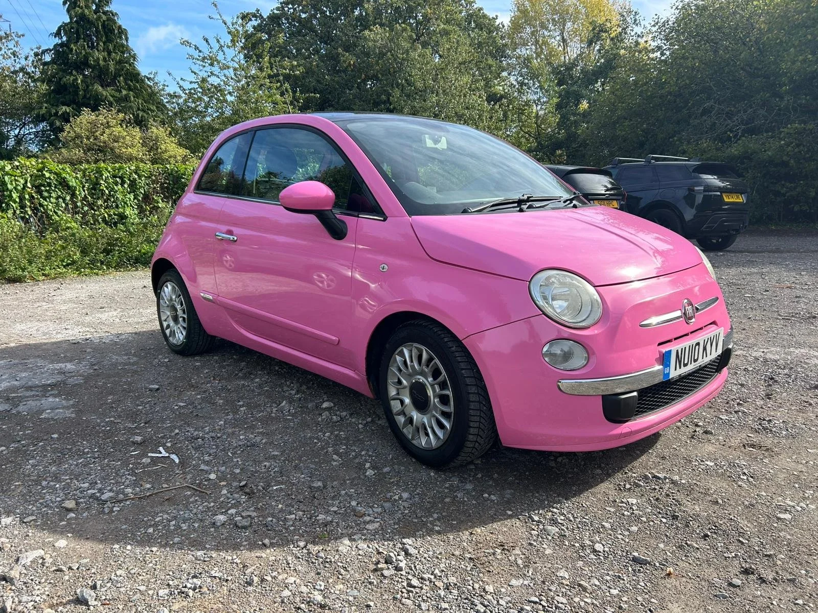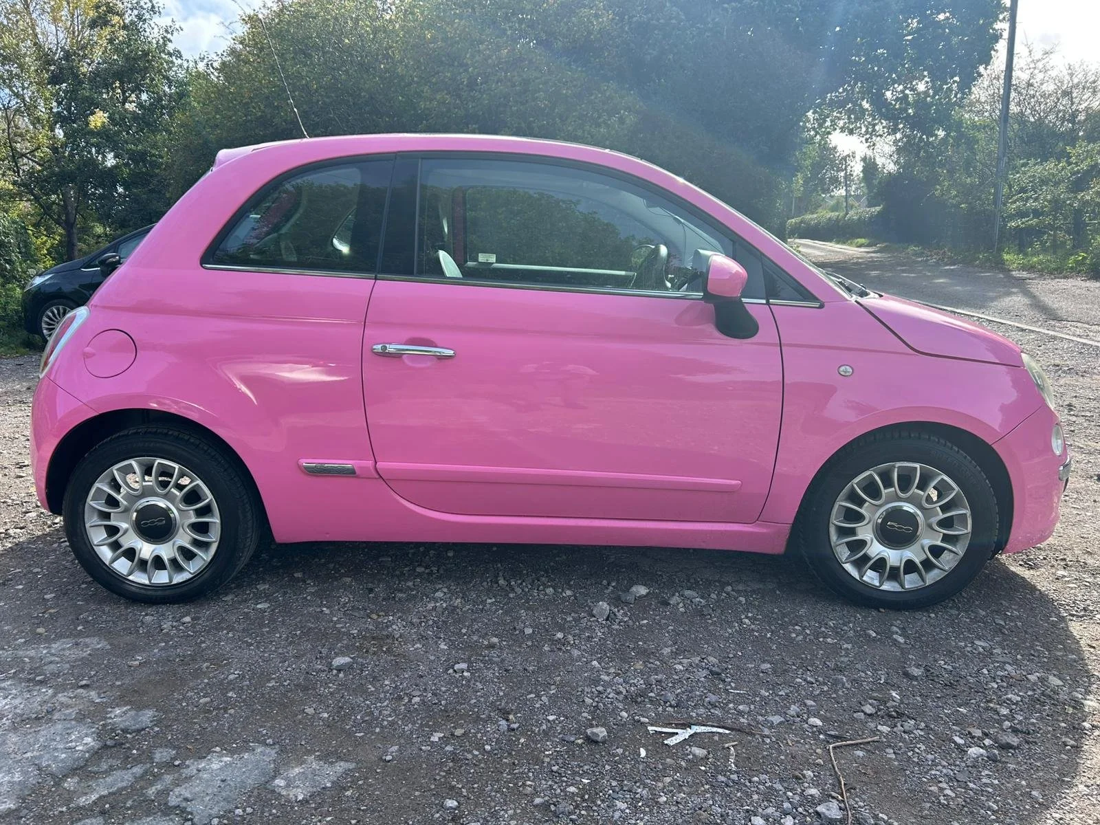 A pink Fiat 500 parked on a gravel surface, with green trees in the background and a black car in the distance.